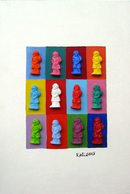 Figuren, kalte Keramik auf Holz, Acryl 24 x 36 cm